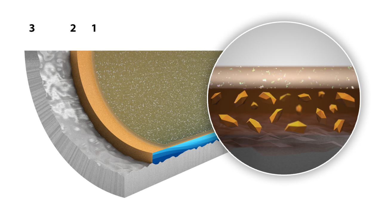 Part 1-abrasion: The inner base of the pan is divided into four quarters. Three of the four quarters are taped with a pre-defined adhesive tape. The pan is placed on the vibrating machine with a mixture of stainless steel balls, corundum and water prepared according to the recipe. After 15 minutes, the first quarter is uncovered and placed under the vibrator a second time. At the end, 3 of the 4 quarters are rubbed off, the last piece is unloaded. The mixture is sieved, the pan is cleaned with liquid detergent, water and a soft sponge and the abraded surfaces are assessed.